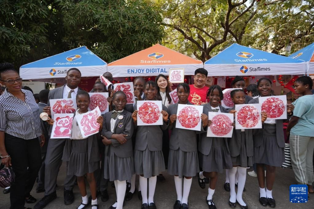 1月25日,在尼日利亚首都阿布贾的尼日利亚中国文化中心,人们手持中国剪纸作品在“欢乐春节”庙会上合影留念。新华社