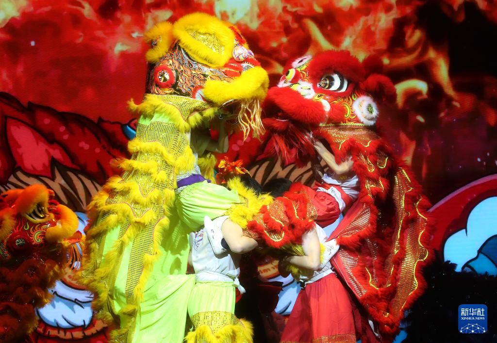 1月20日在白俄罗斯首都明斯克拍摄的中白学生春节联欢晚会上的舞狮表演。新华社