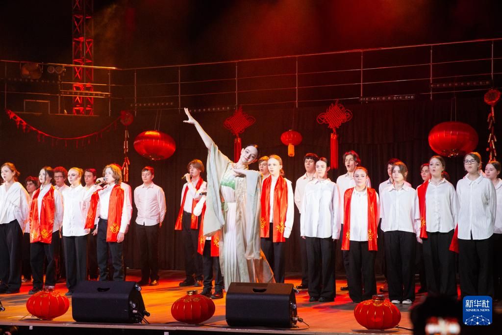 2月3日,由中国驻俄罗斯圣彼得堡总领馆与圣彼得堡“孔子”东方语言文化学院举办的第九届中小学春节联欢节在俄罗斯圣彼得堡举行,近千名中小学生和家长欢聚一堂,共庆中国新春佳节。图为圣彼得堡学生在中小学春节联欢节上表演。新华社