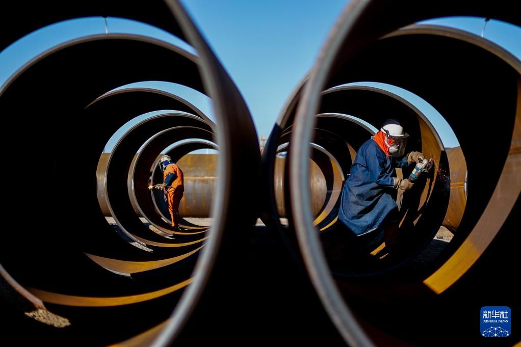 2月5日,工人在海油工程天津智能化制造基地进行钢材预制作业。新华社