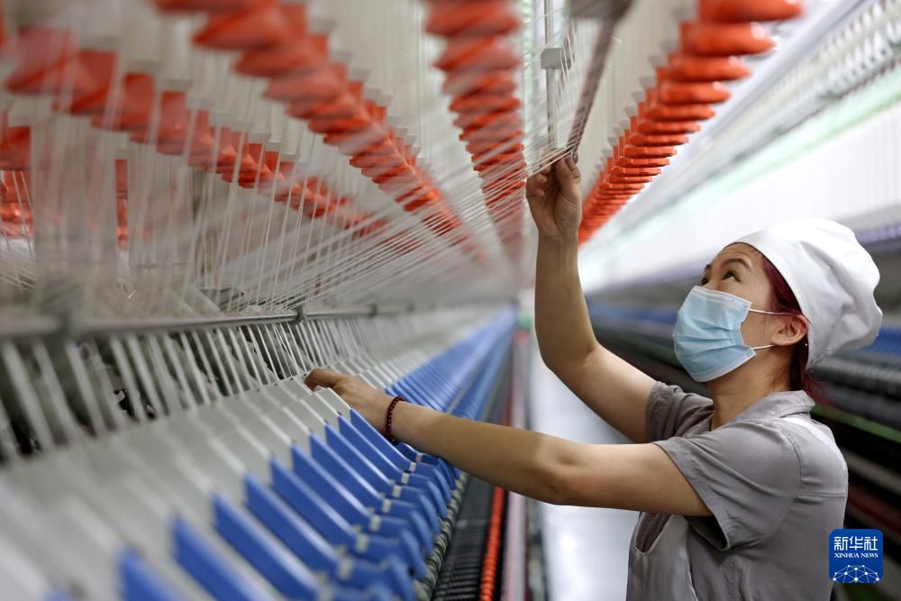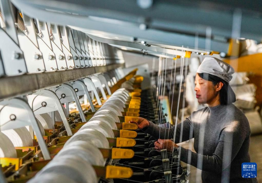 2月5日,山东枣庄经济开发区一家企业工人在加工高端纱线。新华社