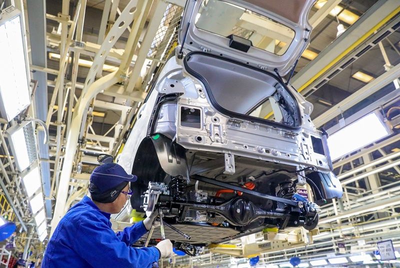 2月5日,位于山东自贸试验区青岛片区的一车辆生产车间,工人在进行新能源汽车的生产作业。央广网