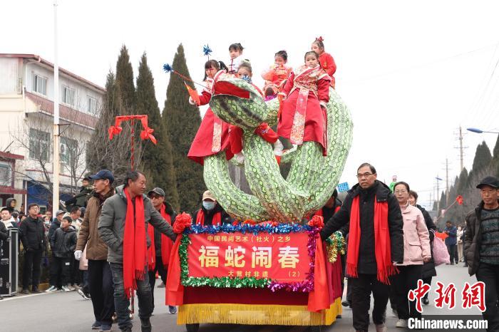 2月11日,在“中国民间文化艺术(社火)之乡”——河南三门峡陕州区大营镇大营村,充满浓郁豫西特色的平垛、坠子、高跷、锣鼓,富有时代气息的武术、扇子舞,轮番上阵,吸引万余名本村及周边民众前来观看。与以往不同,今年的大营社火表演在继续保留幼儿平垛表演的基础,新增加了少年高跷和锣鼓表演。大营社火起源于明清,是集音乐、表演、器乐、杂技、绘画于一体的群众性传统民俗文化艺术活动,2007年2月入选河南省首批非物质文化遗产名录。图为平垛福蛇闹春表演。中新网
