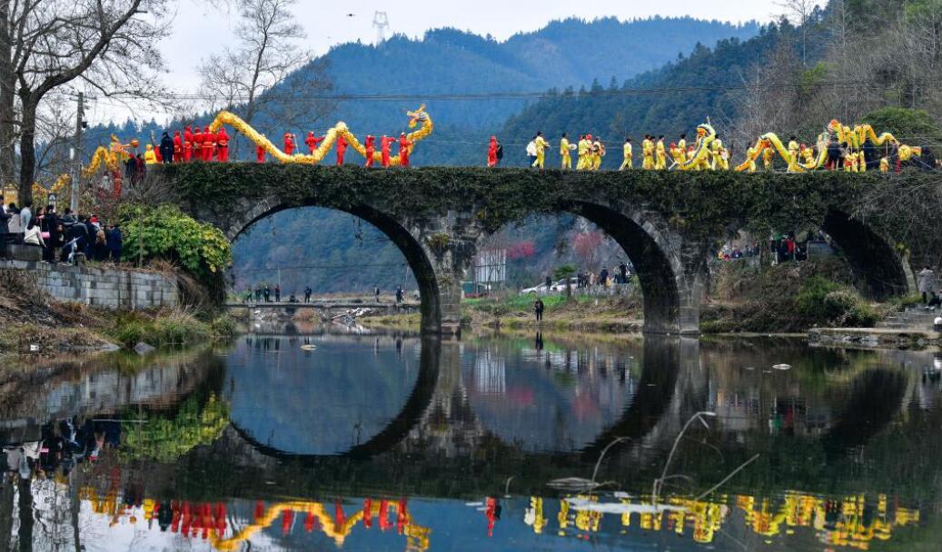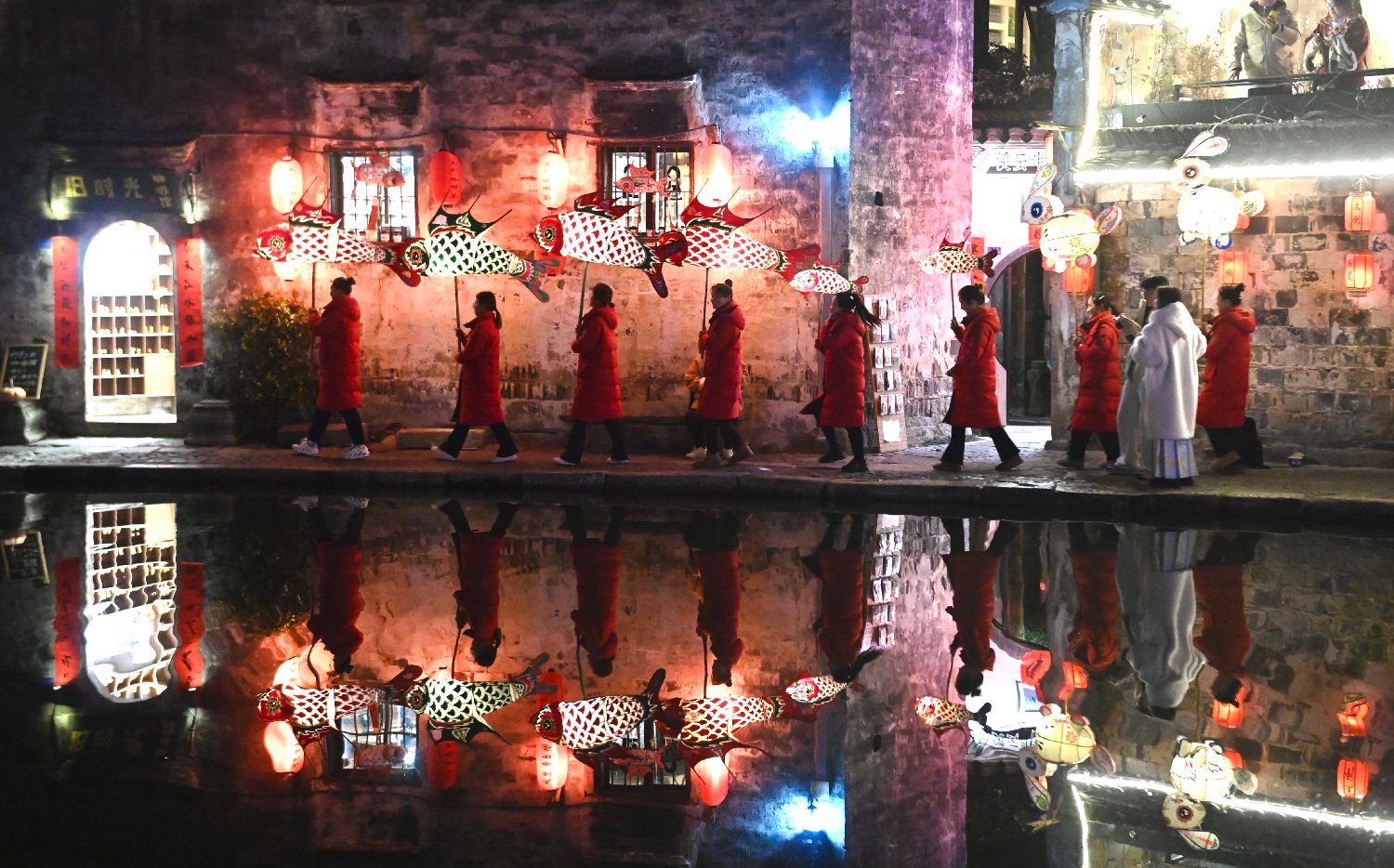 2月11日,安徽省黄山市黟县“闹灯会”在宏村开展巡游活动,鱼灯、兔子灯、生肖花灯穿梭古村,吸引游客观赏体验,为元宵节增添一抹亮色。图为花灯表演队伍手持鱼灯巡游。中新社