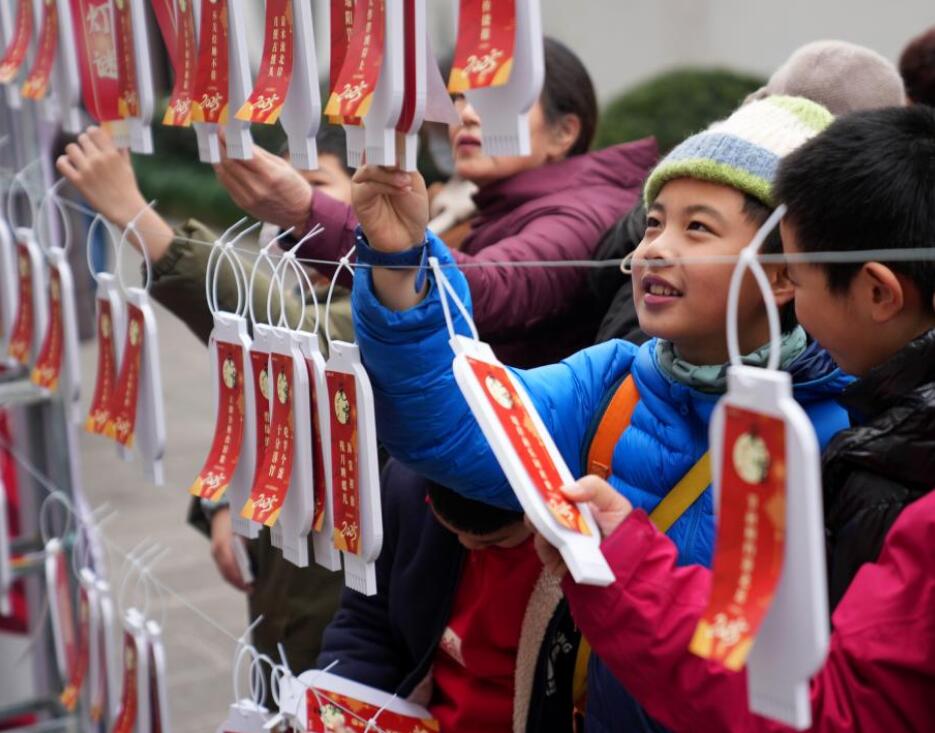 2月11日,在浙江杭州市西湖区北山街道元宵文化庙会活动中,社区居民在猜灯谜。新华社
