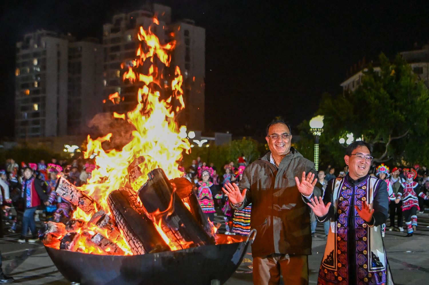 元宵节到来,中国多地举办丰富多彩的民俗活动,欢欢喜喜庆佳节。2月11日晚,云南省楚雄彝族自治州永仁县在赛装文化广场举行“围篝火·闹元宵”打跳狂欢活动,市民和游客以打跳的方式载歌载舞,共迎元宵佳节。图为联合国教科文组织东亚地区办事处主任夏泽翰(左一)与当地民众围着篝火载歌载舞。中新社