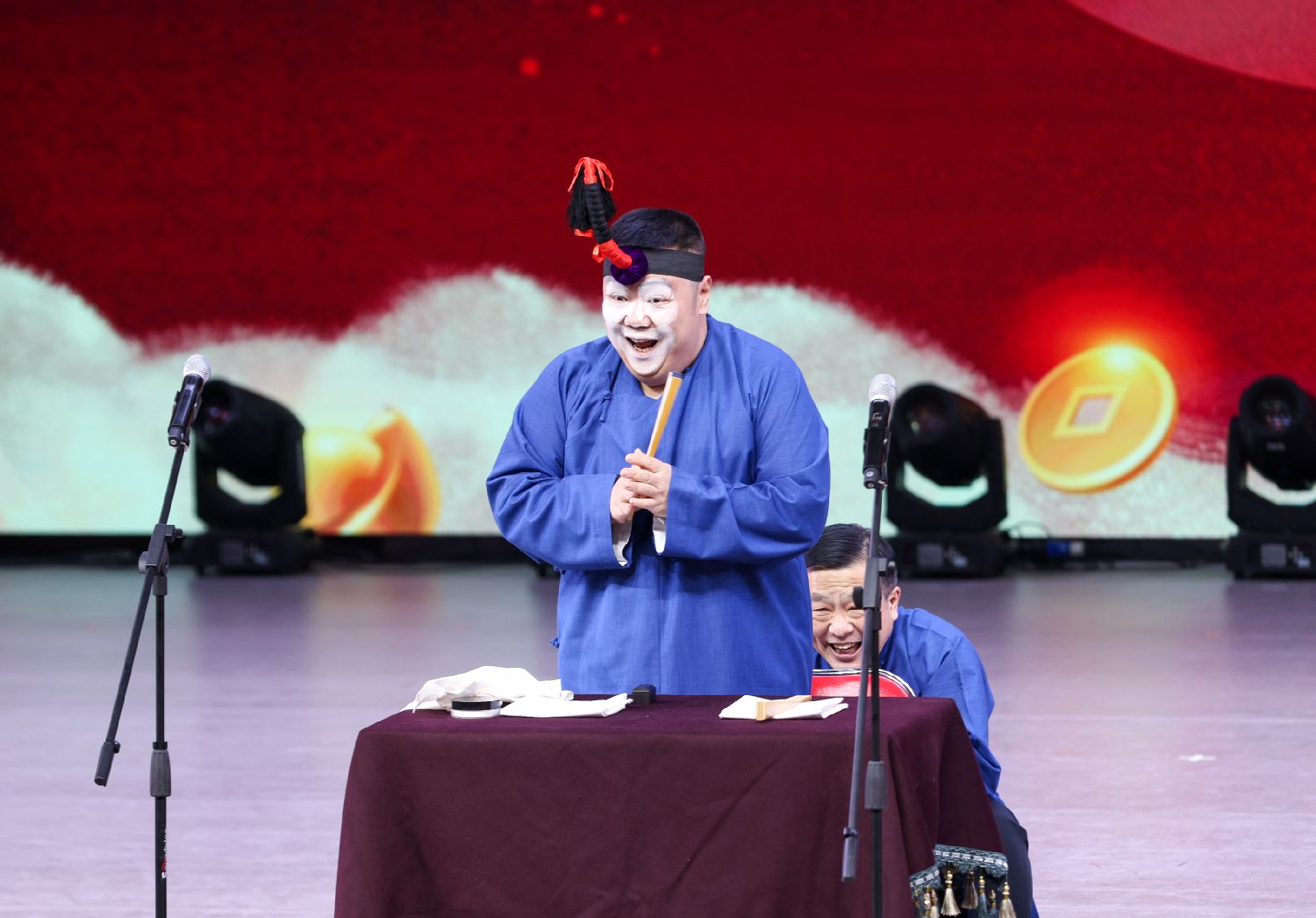 2月11日晚,第十届钟鼓楼相声会元宵节专场演出在北京市东城区少年宫剧场开演。此次相声会以“传统碰撞新潮、幽默对话生活”为主题,吸引了近千名市民齐聚一堂,在欢声笑语中共迎元宵佳节。图为万宇、冯巍表演双簧。中新社