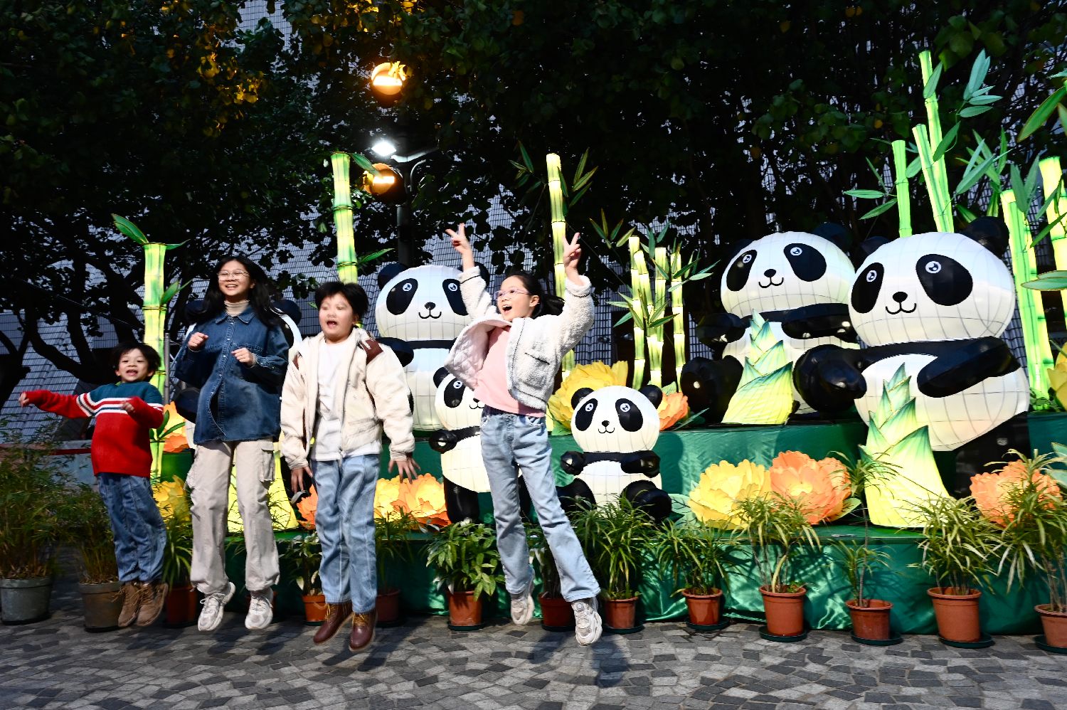2月11日,香港特区政府康乐及文化事务署在香港文化中心举行元宵彩灯会传媒导赏活动,众多民众与大熊猫、孔雀、松鼠等造型的彩灯拍照,并参与猜灯谜活动。现场设有“多彩贵州”非遗市集和“秘景贵州”图片展,贵州文化演艺集团的演员们也在此彩排民族歌舞,吸引民众观看。图为民众与大熊猫造型彩灯合影。中新社