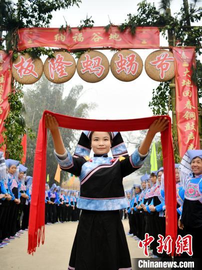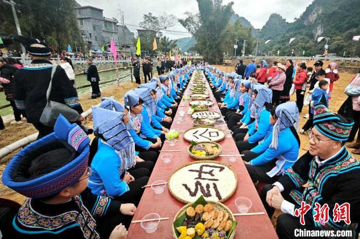 2月12日,广西东兰县长江镇板隆村举办以“蛙婆赐福闹元宵”为主题的2025年“板隆蚂拐节”活动,传承和弘扬壮族铜鼓蚂拐节习俗,深度挖掘开发利用中国国家级非物质文化遗产资源,全方位展示红水河流域壮族非物质文化遗产的魅力。图为板隆村摆开长桌宴,一起闹元宵。
