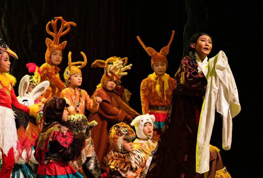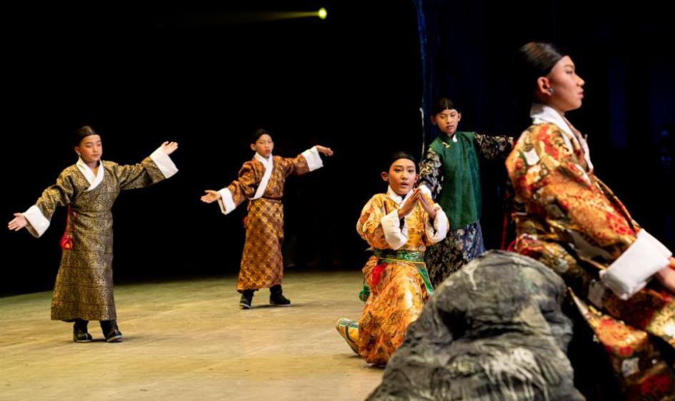 2月11日,西藏首部少儿舞台剧藏戏《顿月顿珠》在拉萨市藏戏艺术中心上演。44名小演员参与表演,其中最小的年仅5岁。图为《顿月顿珠》演出现场。