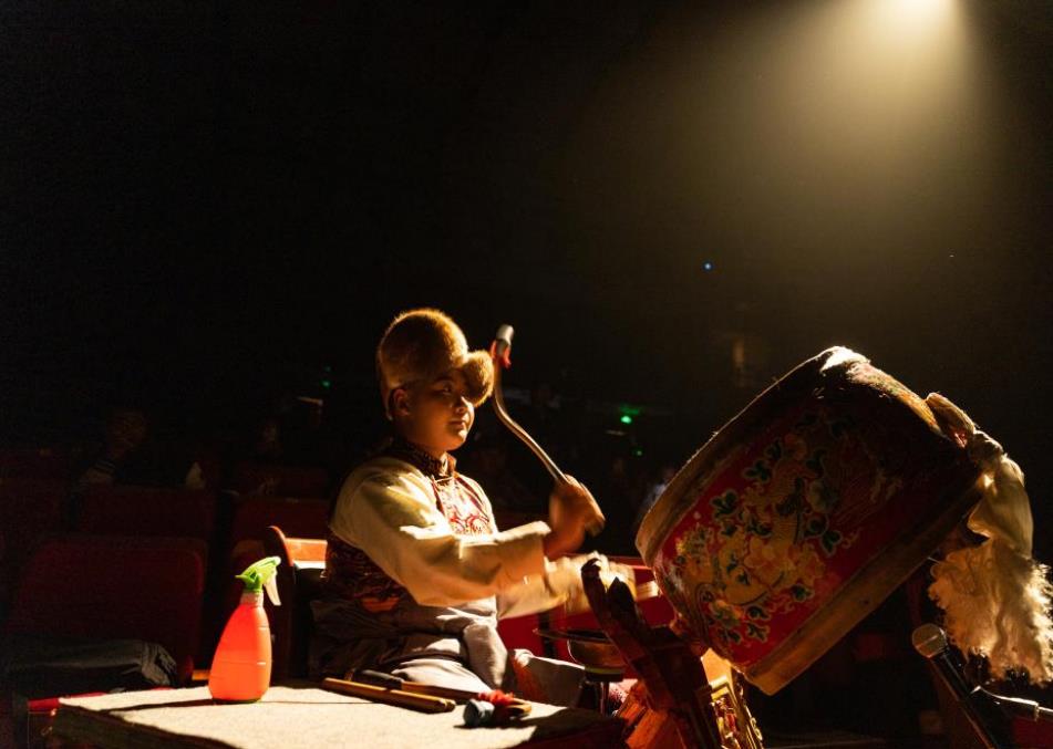 小演员敲锣打鼓为藏戏表演伴奏。