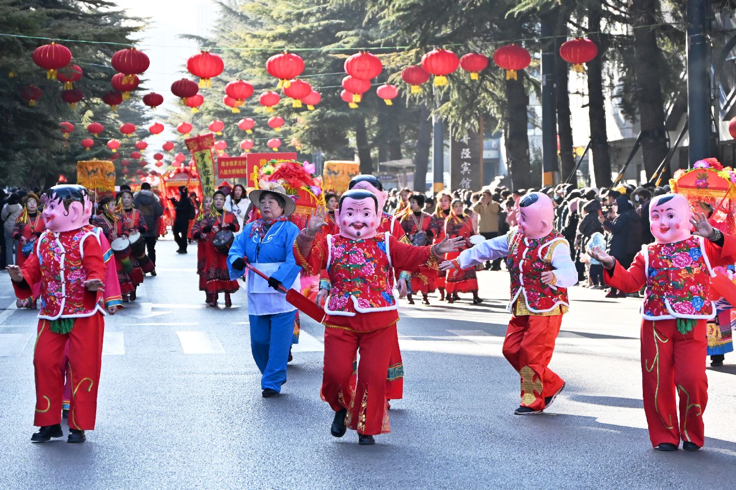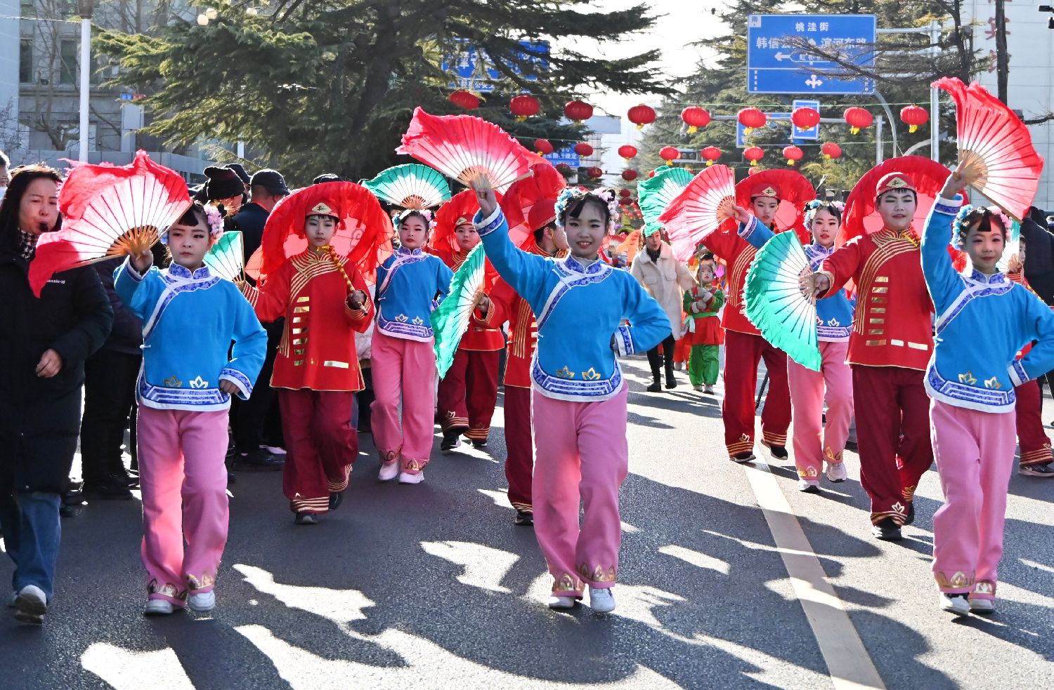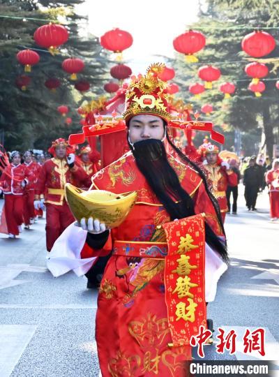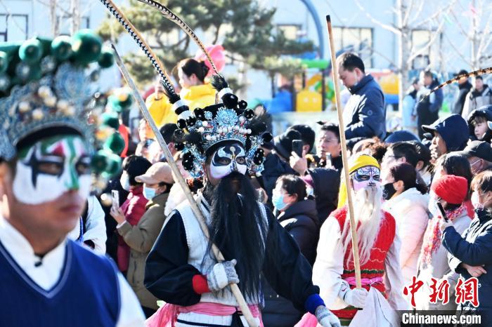 民俗演员们在县城街道为观众展示多种民俗表演。中新社