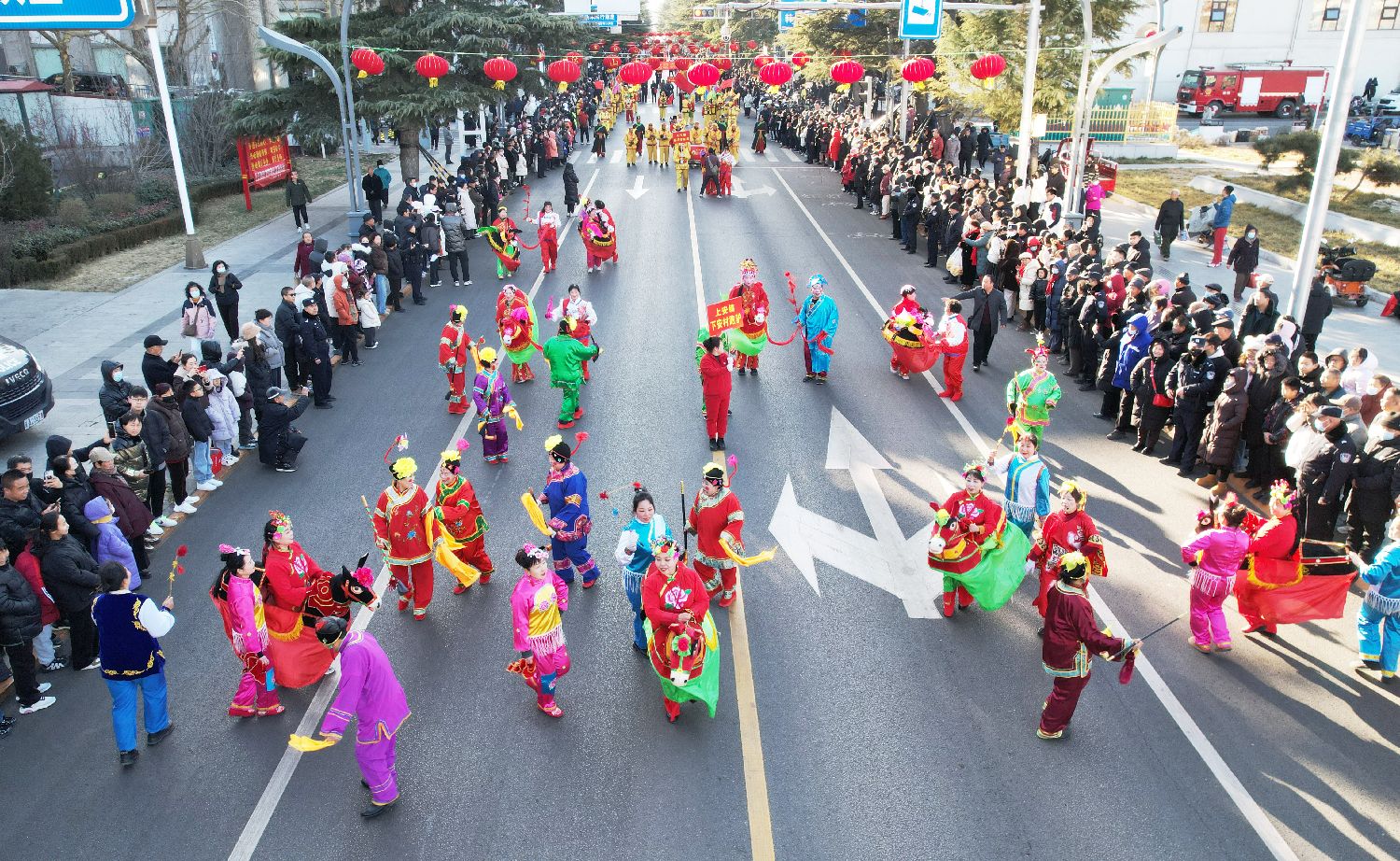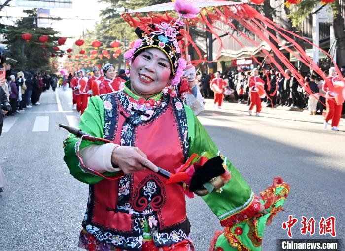 演员们在县城街道为观众展示多种民俗表演。中新社