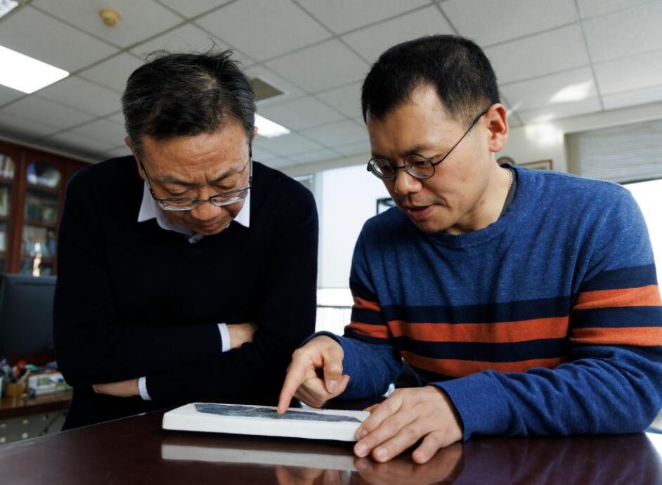 2月10日,古脊椎所王敏研究员(右)和周忠和院士在办公室讨论政和八闽鸟化石标本下一步的研究方向。新华社
