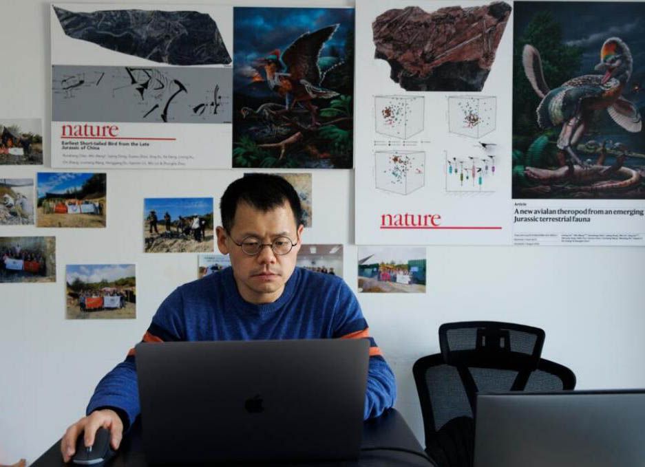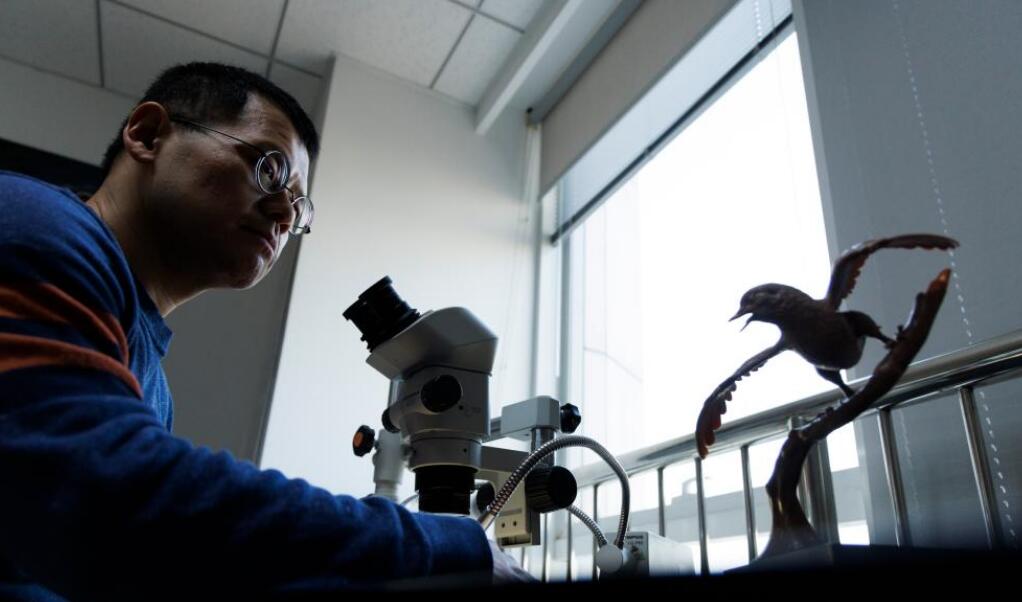 最近,中国科学家团队在政和动物群研究取得一项改写鸟类演化史认知的重要化石发现——距今约1.5亿年、比始祖鸟更像(接近)鸟、确证早期鸟类起源的全球最古老鸟类“政和八闽鸟”。其揭示现代鸟类体型结构在约1.5亿年前的侏罗纪晚期就已出现,并将以尾综骨为代表的鸟类重要特征的出现时间提早了近2000万年。图为2月10日,古脊椎所王敏研究员在办公室工作。新华社