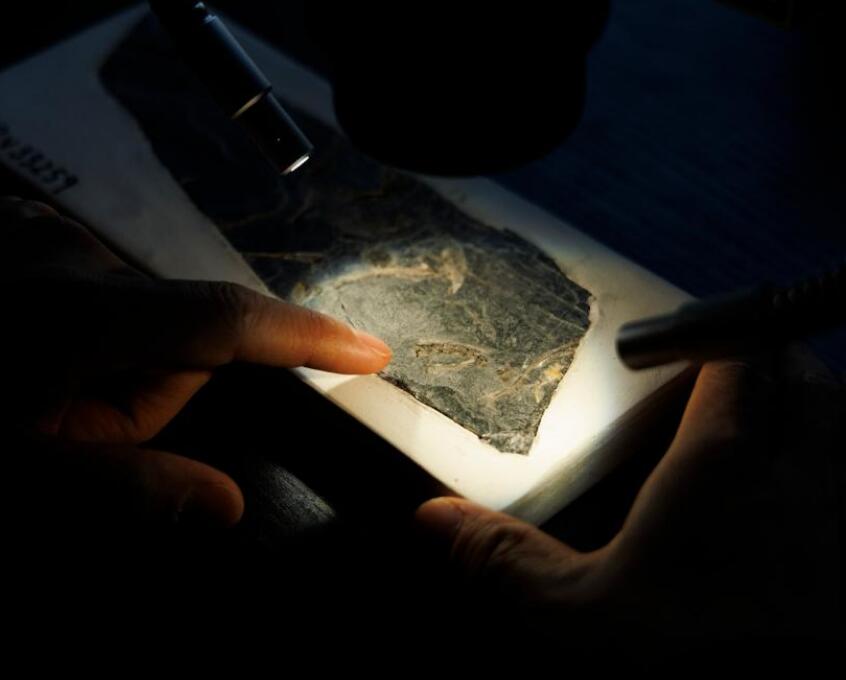 2月10日,古脊椎所王敏研究员在办公室观察政和八闽鸟化石标本,左手手指所指处即是尾综骨化石。新华社