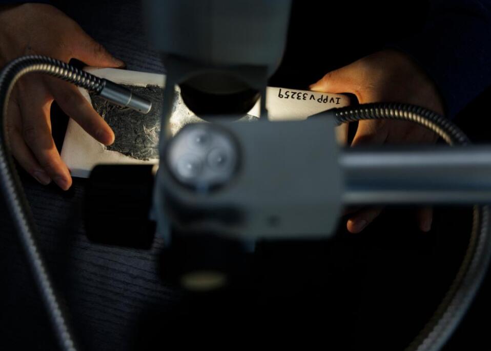 2月10日,古脊椎所王敏研究员在办公室观察政和八闽鸟化石标本。新华社