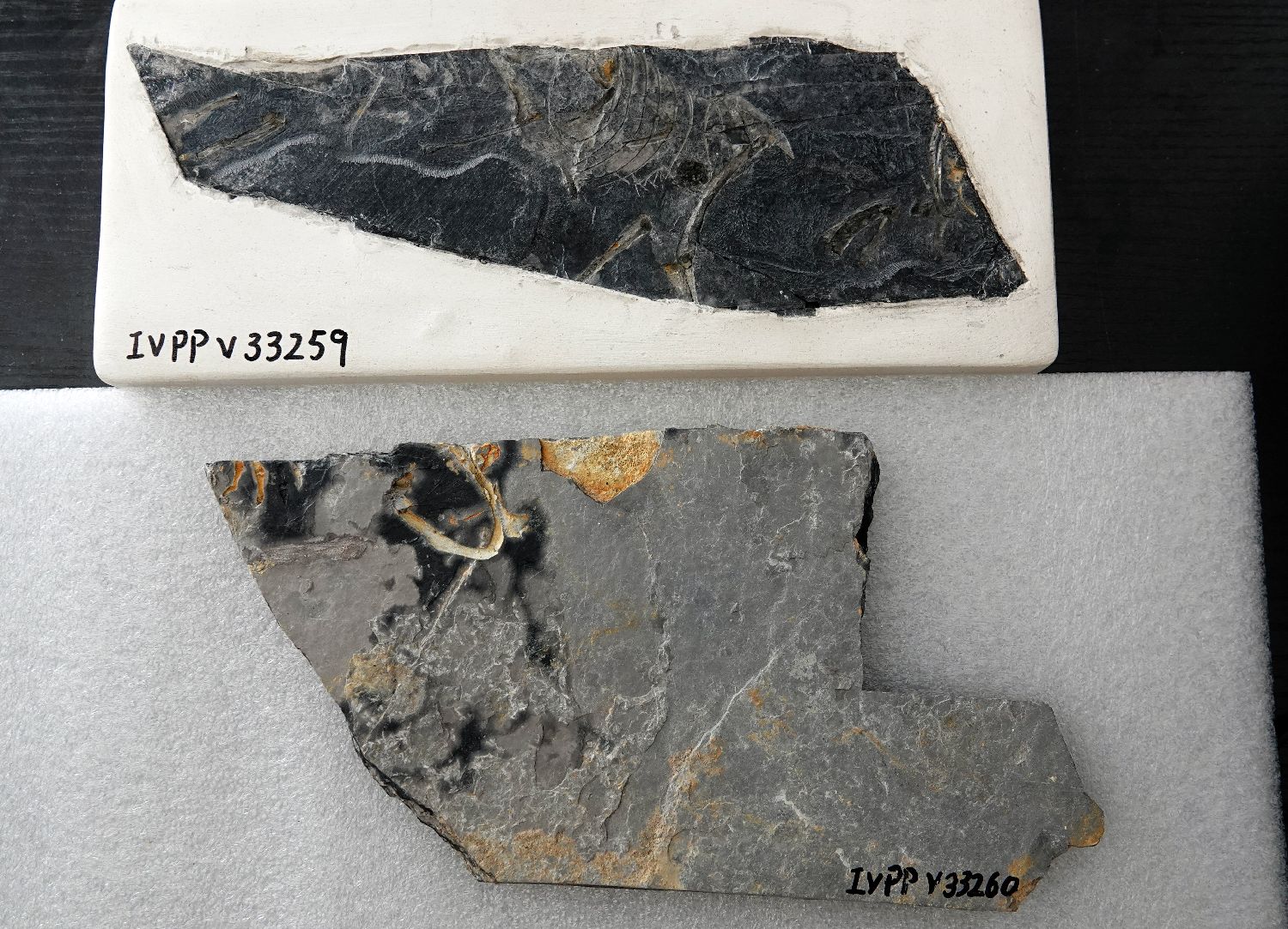 2月10日,中国科学院古脊椎所在北京向媒体展示政和动物群新发现的“政和八闽鸟”化石(上)和单独保存的叉骨化石。中新社