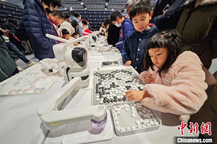 2月16日,小观众在AI智能机器人科普展上与“机器人”下棋。中新网