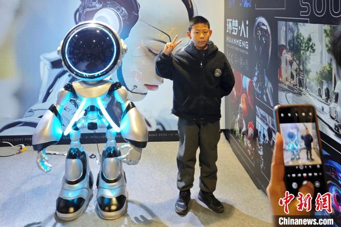 2月16日,小观众在AI智能机器人科普展上与展示的“机器人”合影。中新网