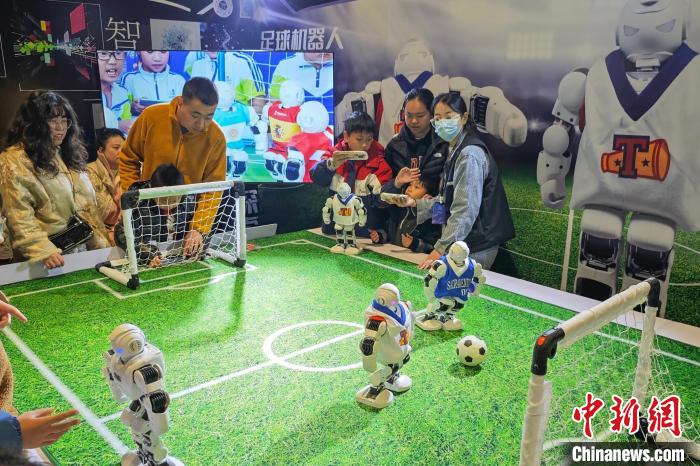 2月16日,小观众在AI智能机器人科普展观看“机器人”踢足球。中新网