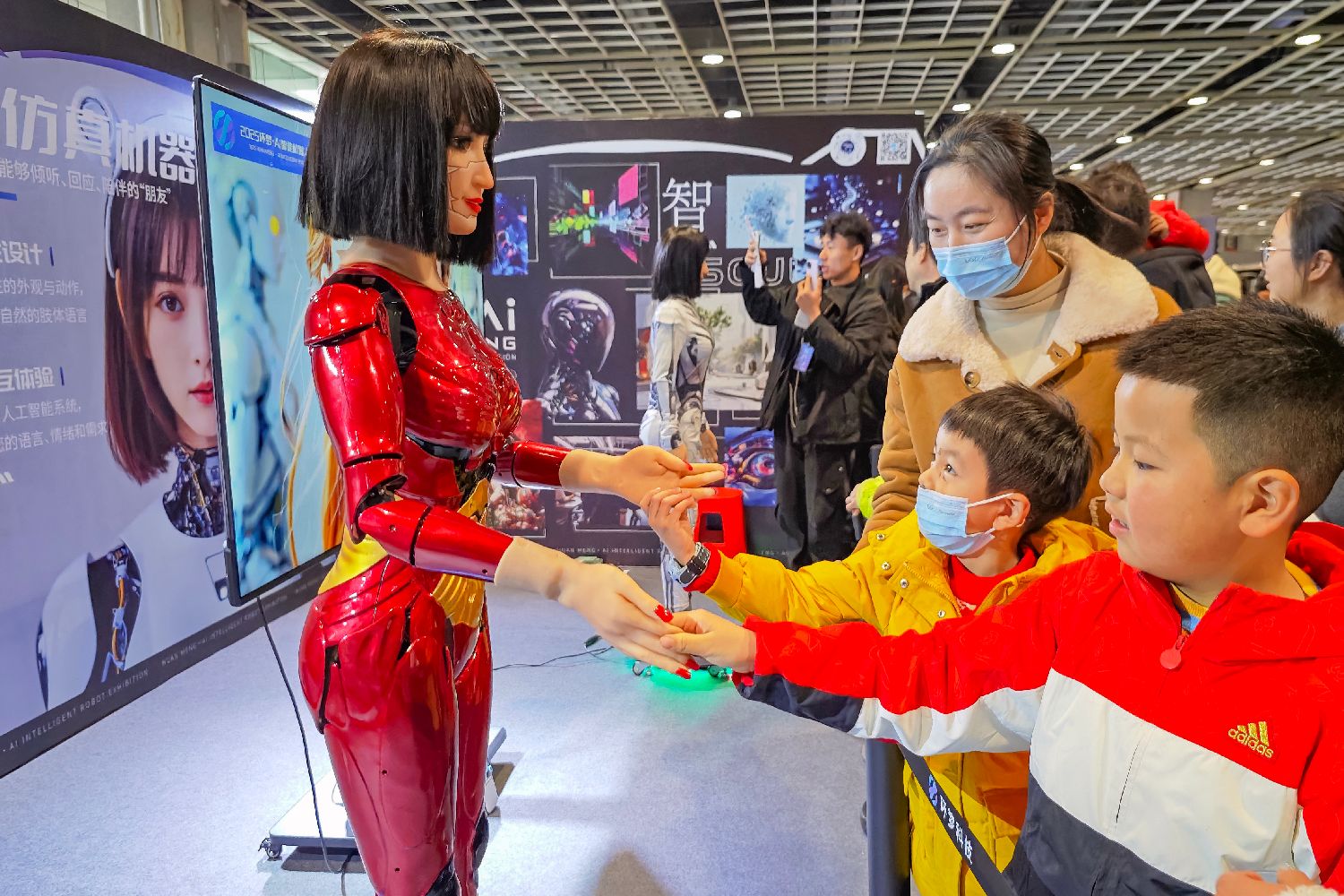 AI智能机器人科普展览近日在江苏南京国际展览中心举办,从能歌善舞、与人互动的娱乐机器人,到可以完成复杂任务、协助人类工作的工业机器人,集中展示了现代科技的魅力。图为2月16日,观众在展览上与“机器人”互动。中新社