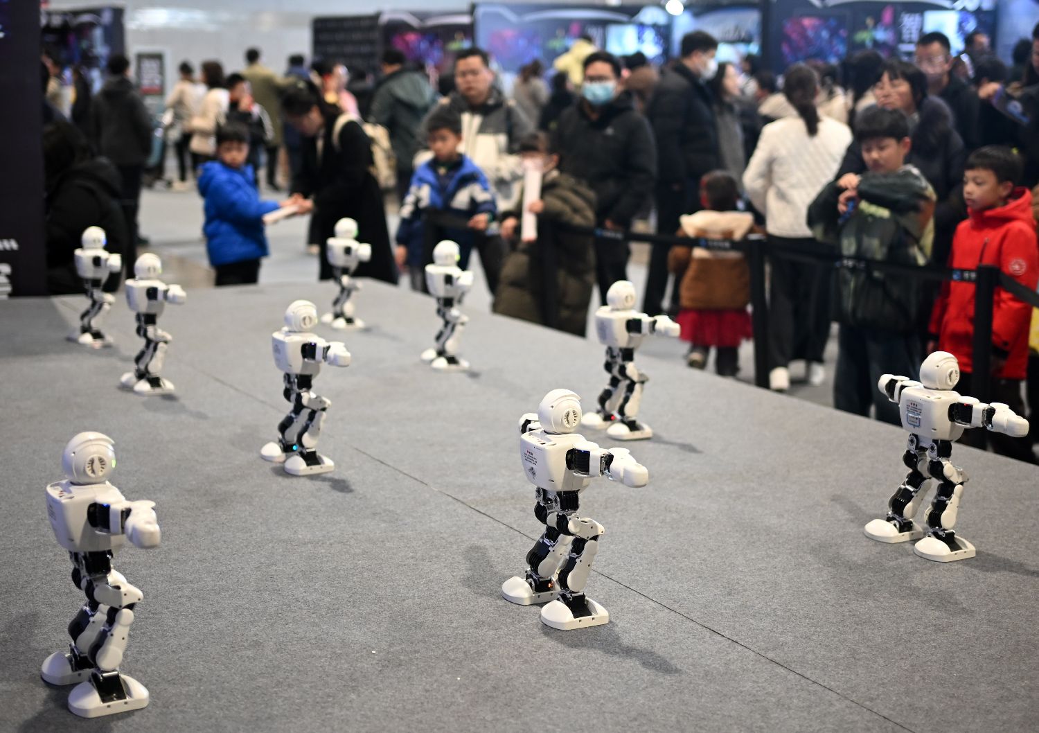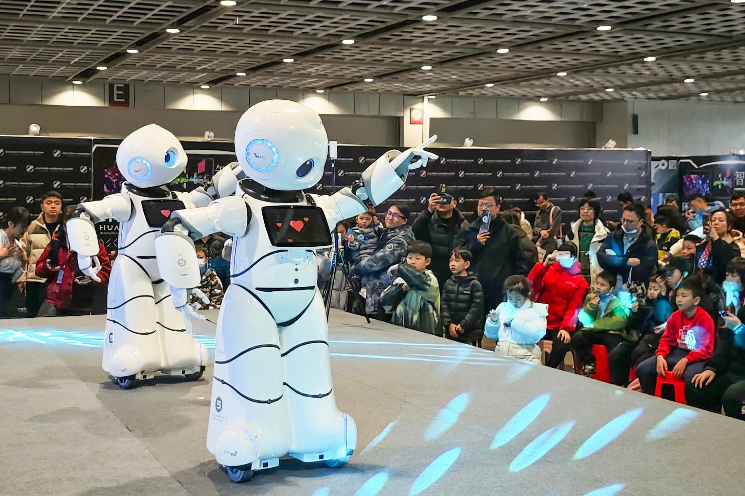 2月16日,观众在AI智能机器人科普展上欣赏“机器人”跳舞。中新社