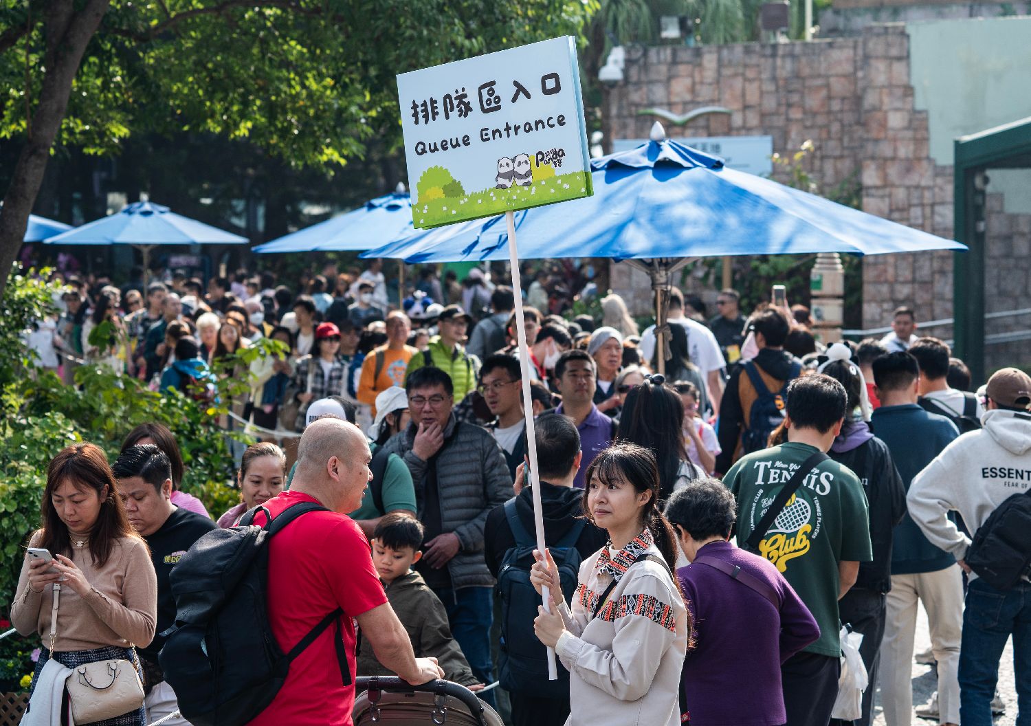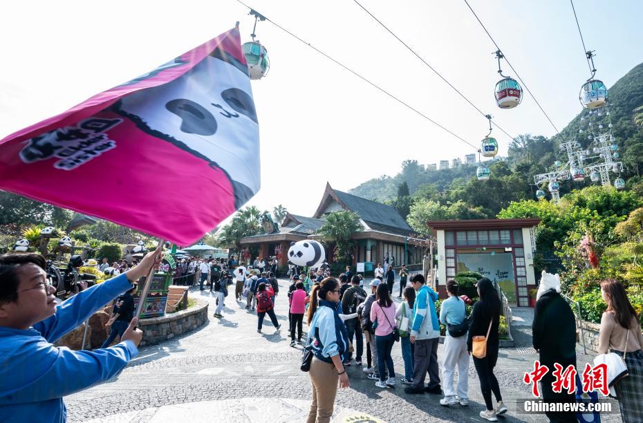 2月16日,海洋公园工作人员手持标示牌引导游客排队。中新社