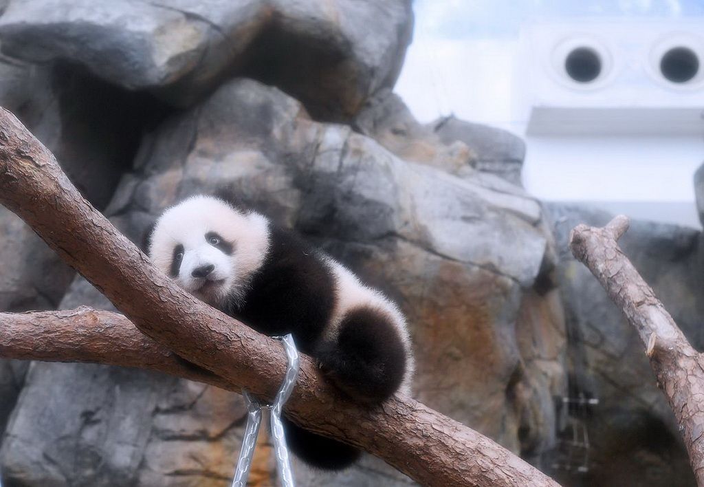 2月15日,大熊猫宝宝在香港海洋公园“大熊猫之旅”熊猫生活场馆内玩耍。新华社