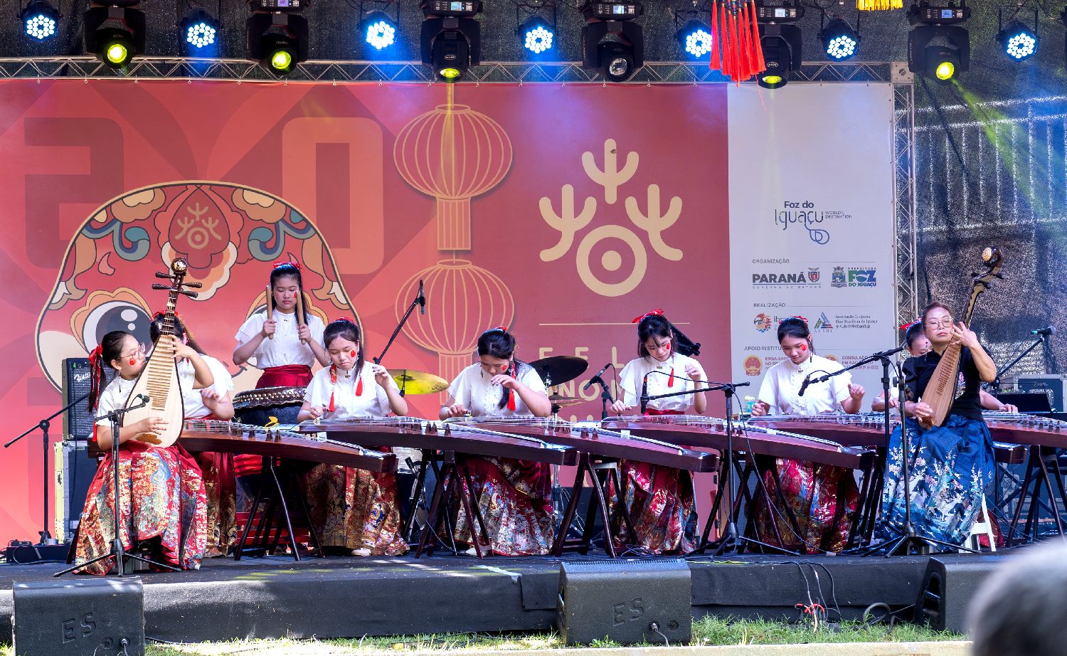 当地时间2月16日,巴西“瀑布城”伊瓜苏,旅居巴西和阿根廷的华侨华人与当地民众观赏“欢乐春节”演出节目。图为旅巴华人国乐团与巴西乐团同台演出。中新网