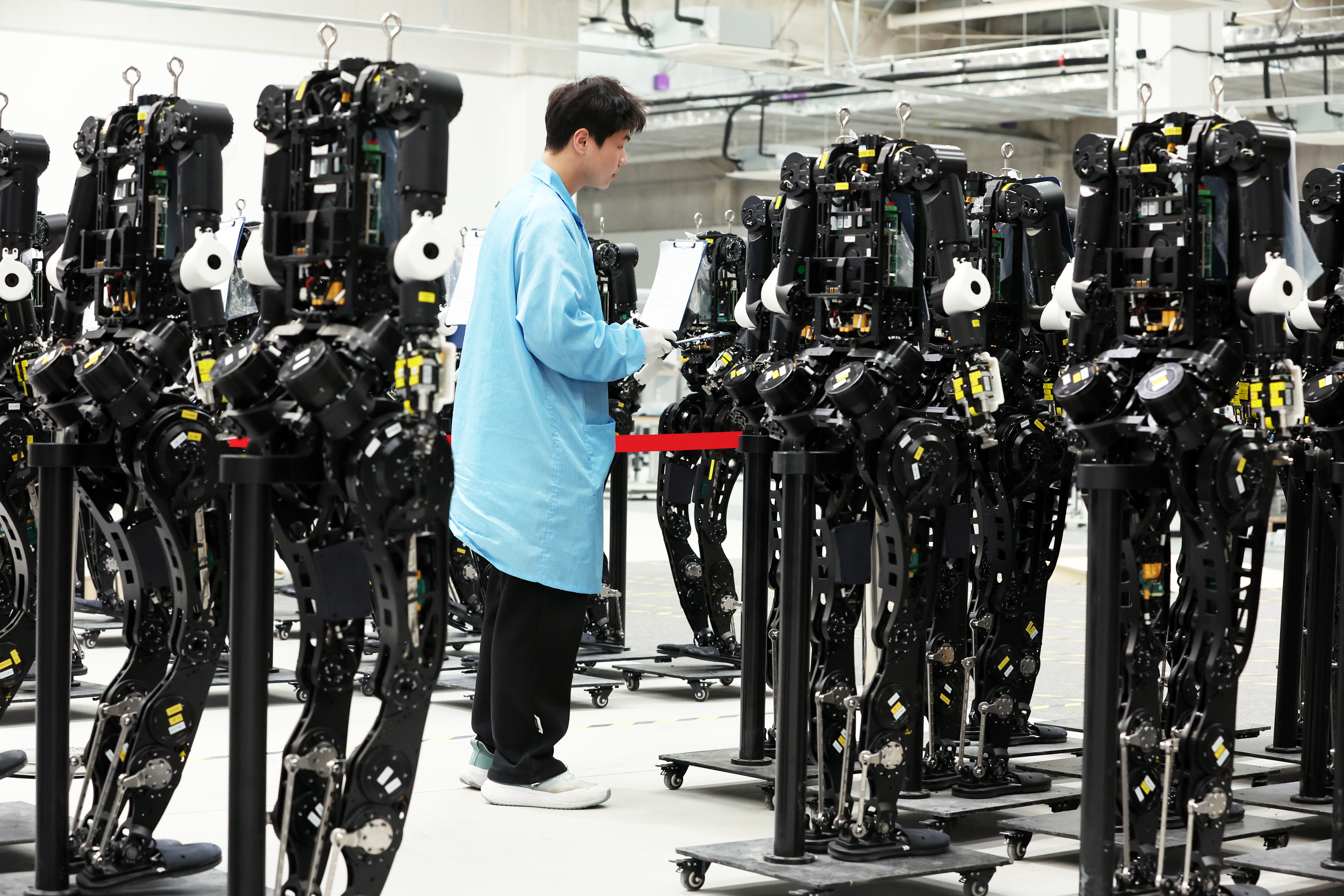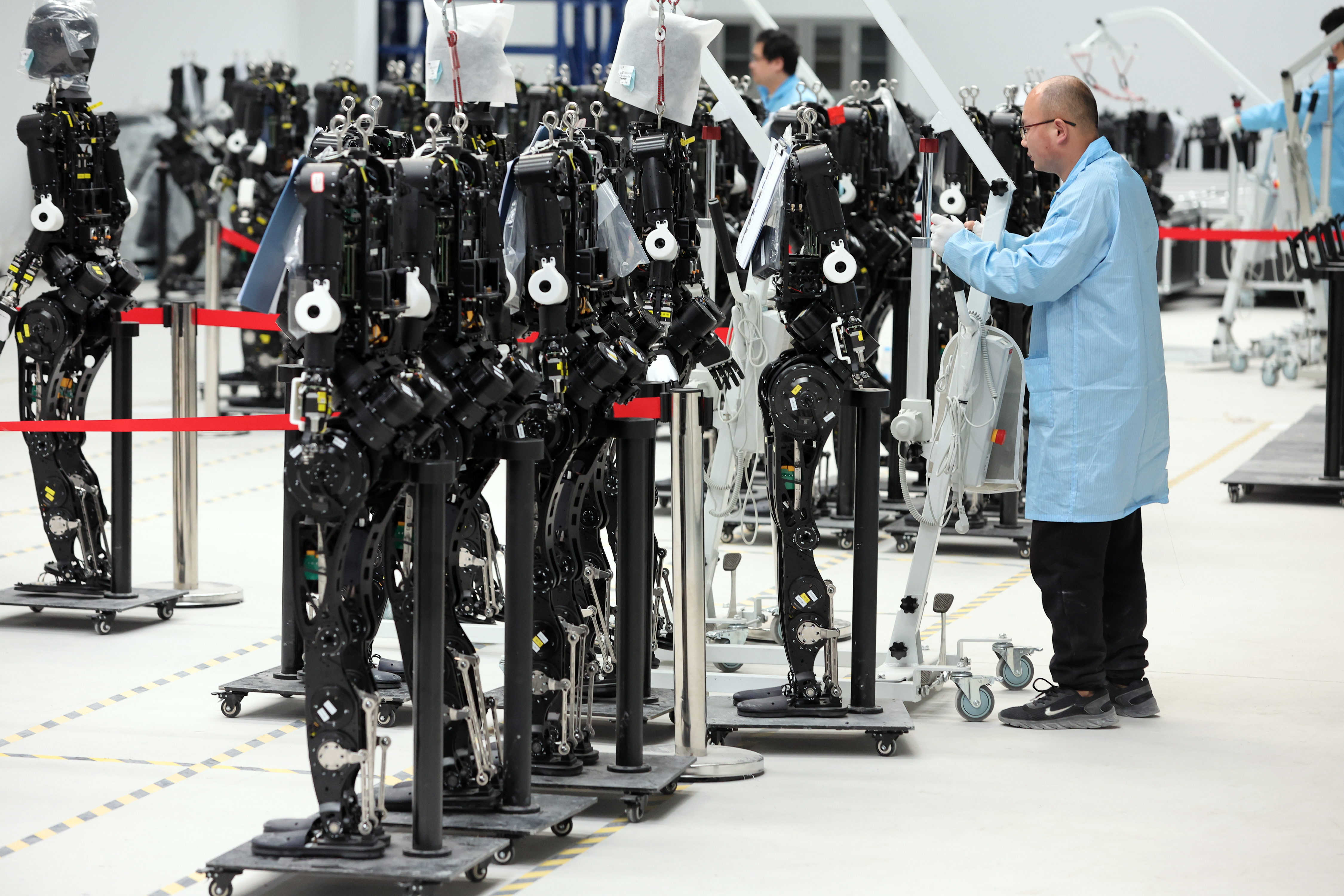 近日,上海首座人形机器人量产工厂——智元新创技术有限公司一期工厂实现大规模量产。目前,这家企业共推出了5款机器人,涵盖交互、重载搬运、数据采集、科研和工厂作业等多个领域。图为2月18日,工程师在训练人形机器人采集信息。