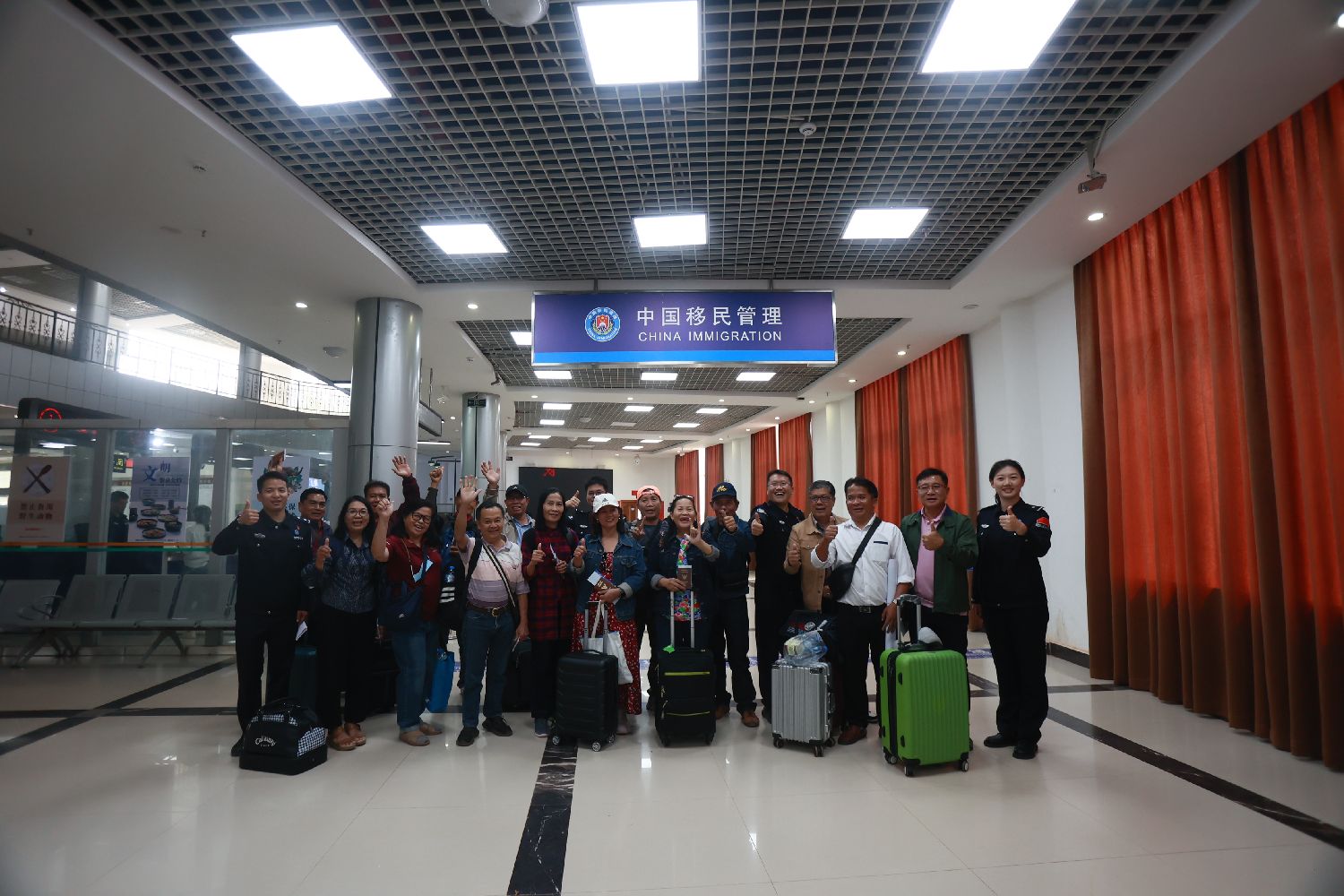 2月18日,来自泰国和老挝的游客在出站口受到欢迎。新华社