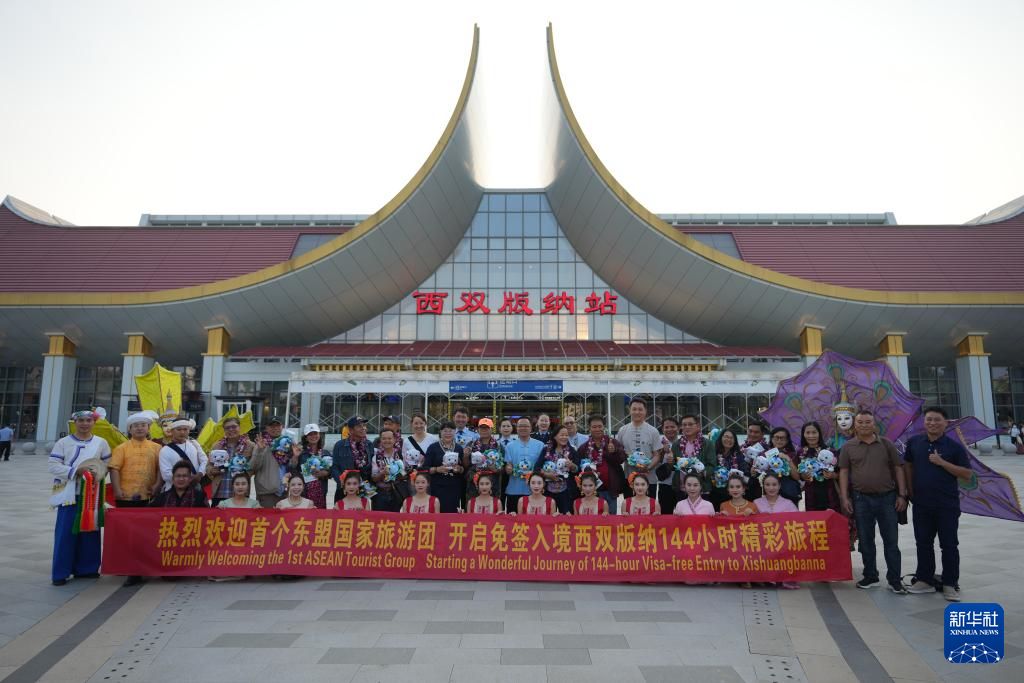 2月18日,由15名老挝和泰国游客组成的旅游团从磨憨口岸入境后乘坐火车抵达云南省西双版纳傣族自治州景洪市。这是东盟国家旅游团入境云南省西双版纳傣族自治州免签政策实施后,抵达的首个旅游团。图为首个东盟国家免签旅游团入境西双版纳,合影留念。中新社