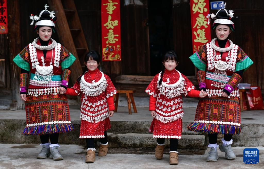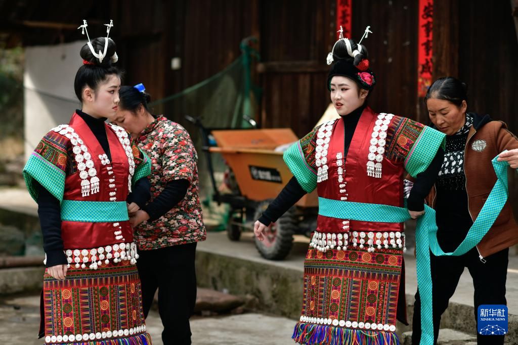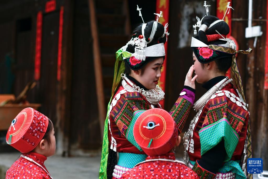 2月15日,在贵州省凯里市舟溪镇舟溪村茶林苗寨,长辈在帮助双胞胎姐妹杨柠羽(左一)、杨柠竹(左三)穿戴苗族盛装。