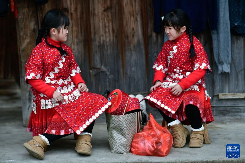 2月15日,在贵州省凯里市舟溪镇舟溪村茶林苗寨,苗族双胞胎姐妹杨柠咛(左)、杨柠微在一起玩耍。