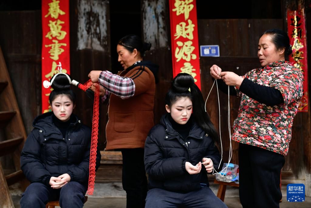 2月15日,在贵州省凯里市舟溪镇舟溪村茶林苗寨,长辈在帮助双胞胎姐妹杨柠羽(左一)、杨柠竹(左三)绑扎发髻。