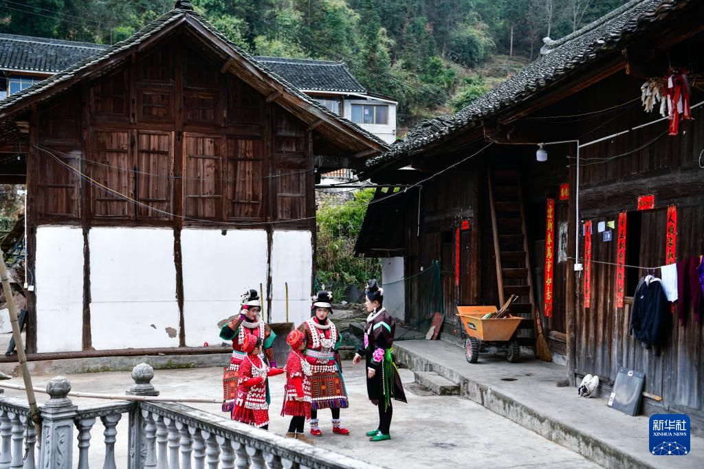 2月15日,在贵州省凯里市舟溪镇舟溪村茶林苗寨,两对苗族双胞胎姐妹穿戴盛装完毕后在一起交流。