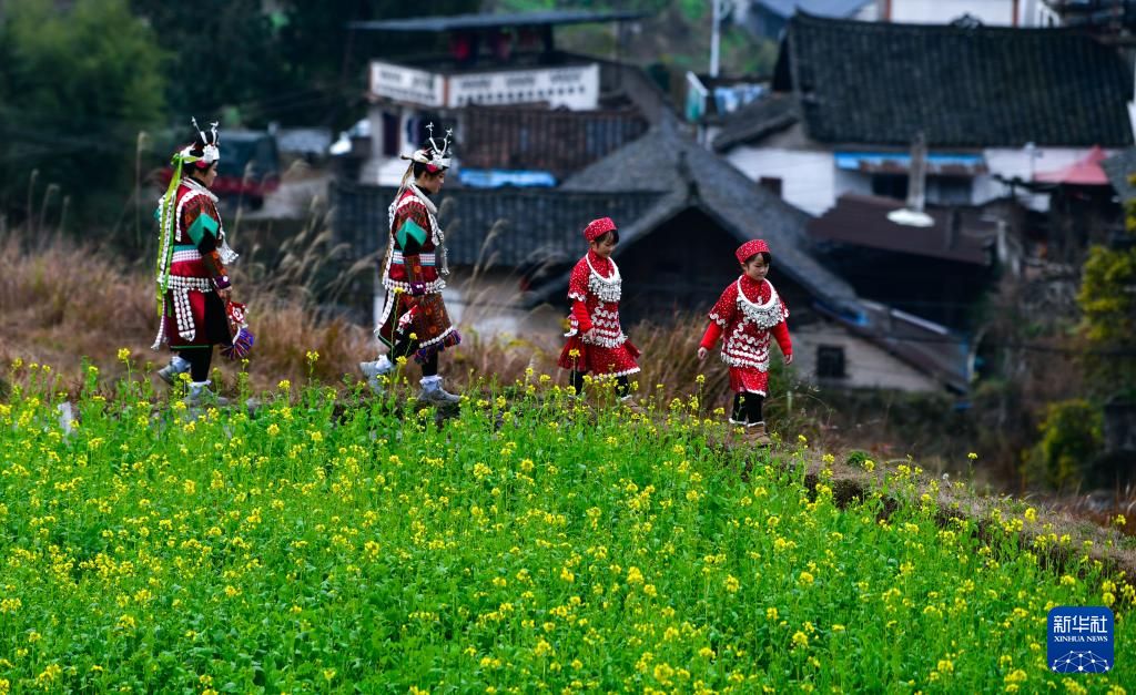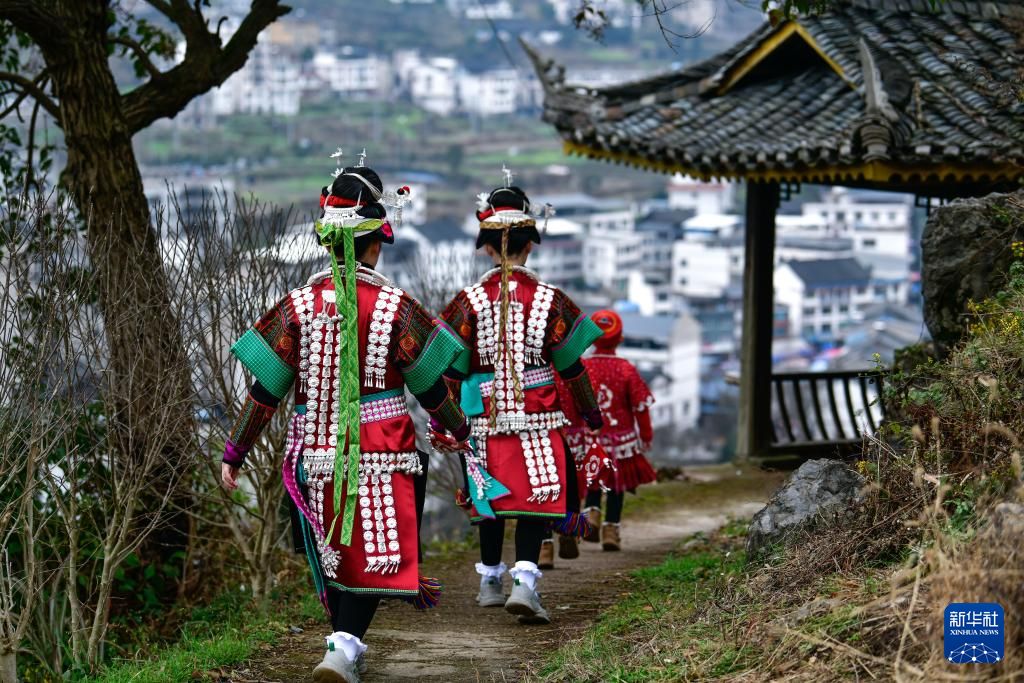 2月15日,在贵州省凯里市舟溪镇舟溪村茶林苗寨,两对苗族双胞胎姐妹前往“甘囊香”芦笙堂参加芦笙节活动。