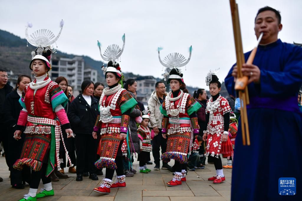 2月15日,在贵州省凯里市舟溪镇“甘囊香”芦笙堂,苗族双胞胎姐妹杨柠竹(中排左二)、杨柠羽(中排左三)与小伙伴在跳芦笙舞。