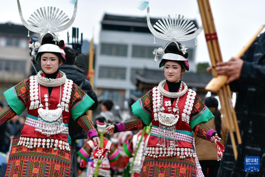 2月15日,在贵州省凯里市舟溪镇“甘囊香”芦笙堂,苗族双胞胎姐妹杨柠竹(左)、杨柠羽在跳芦笙舞。