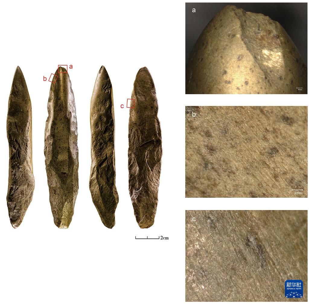 吉林和龙市大洞旧石器时代遗址第二阶段出土的局部磨光石器(左)及其微痕特征(拼版照片,资料照片)。新华社