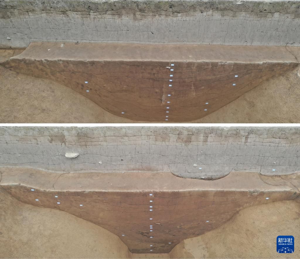 甘肃临洮县寺洼遗址南段东侧“围壕”解剖沟西壁剖面(上为外圈,下为中圈)(资料照片)。新华社