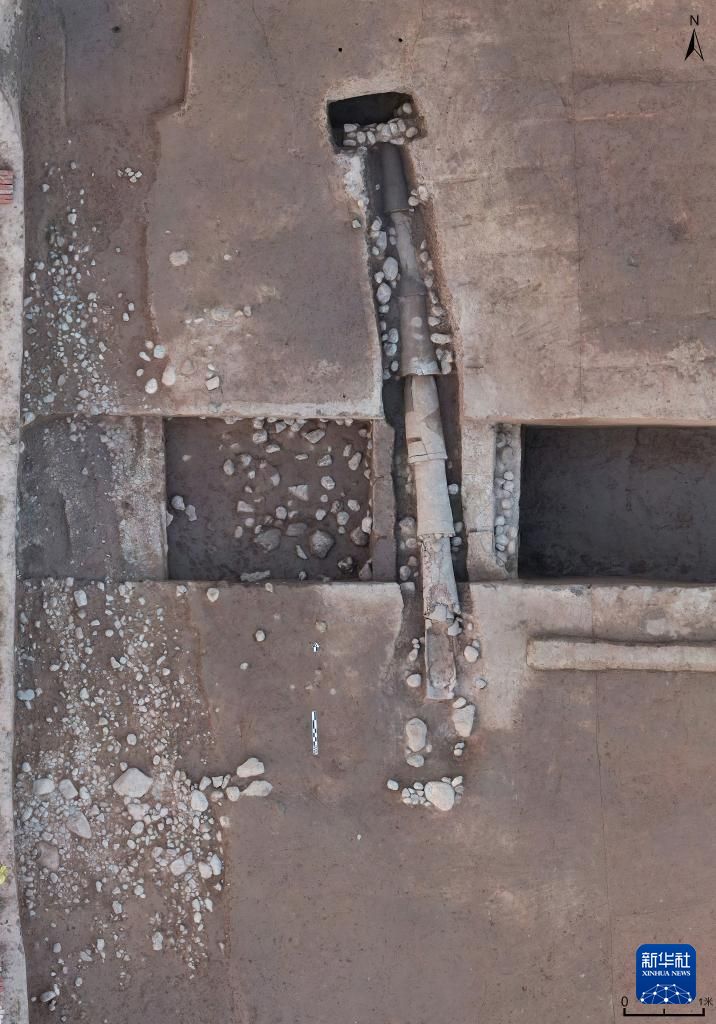 陕西宝鸡市周原遗址宫城西北角铺石道路及陶排水管道(资料照片)。新华社