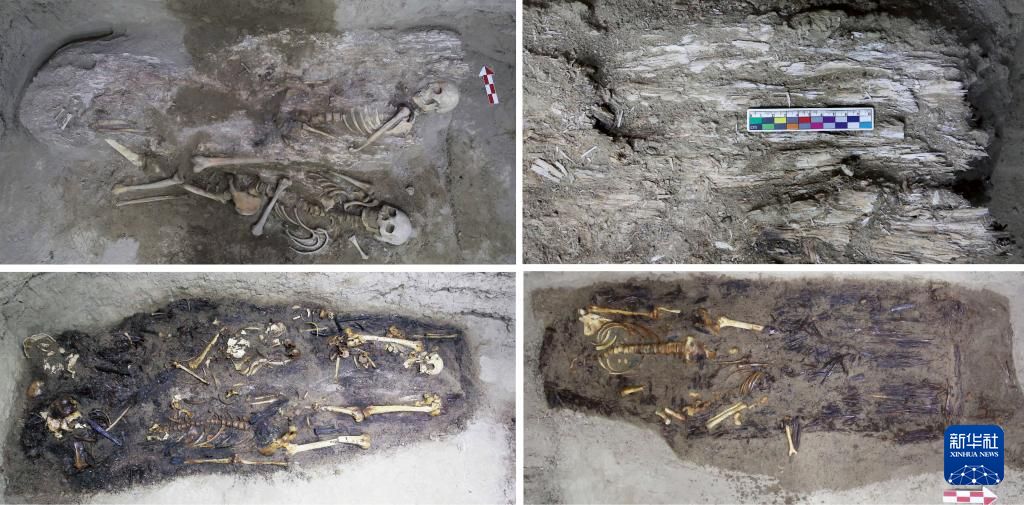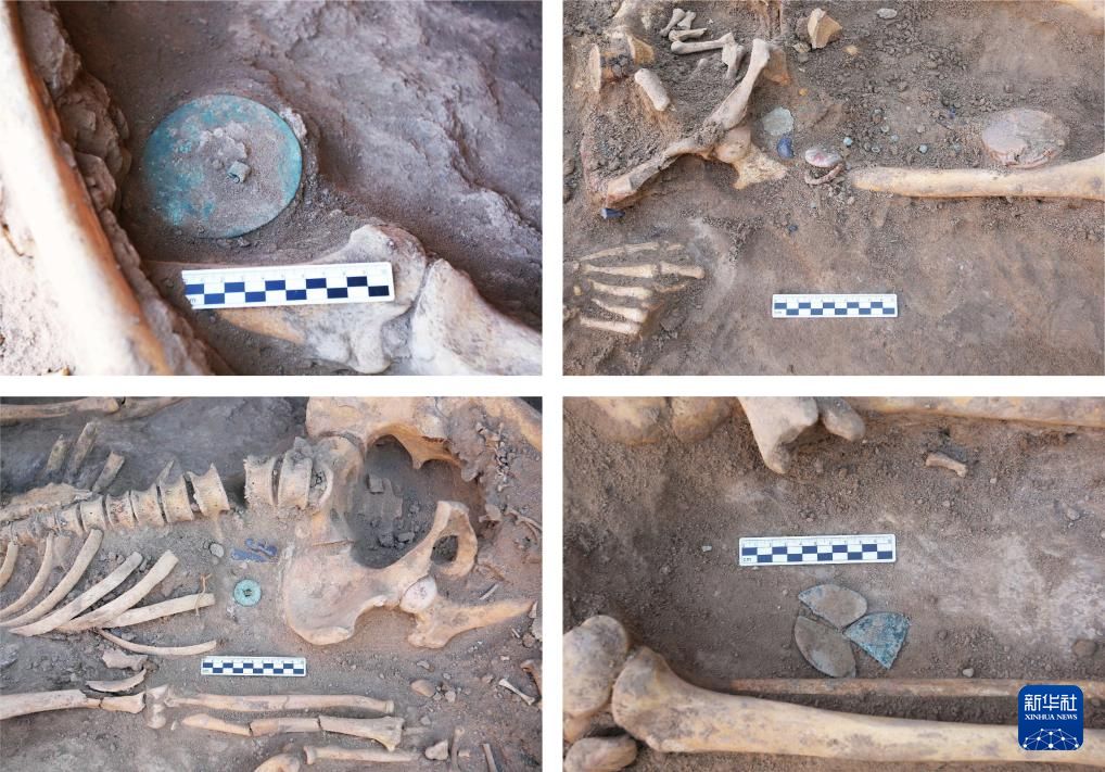 乌兹别克斯坦蒙扎铁佩遗址M7随葬品出土情况(拼版照片,资料照片)。新华社