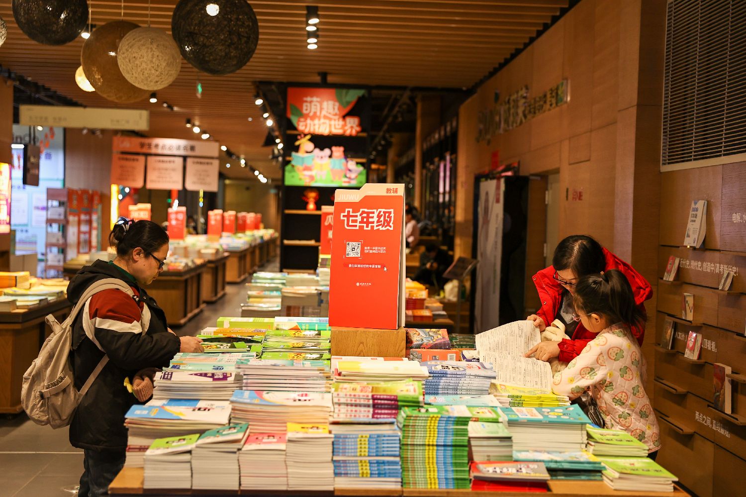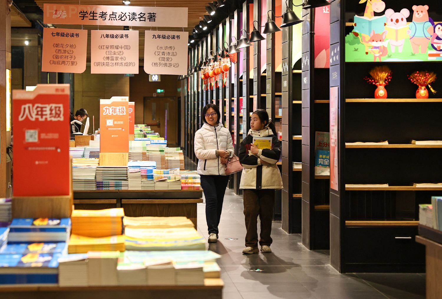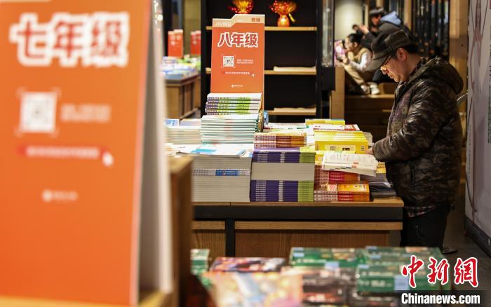 2月19日,临近开学,学生和家长也忙碌起来,为新学期添置“新装备”。在辽宁沈阳玖伍文化城迎来新一轮“购书潮”。各类教材、教辅书籍库存充足,文具用品摆放整齐,不少家长、学生纷纷到书店选购各类书籍,为新学期做准备。图为家长和学生购买教材。中新社