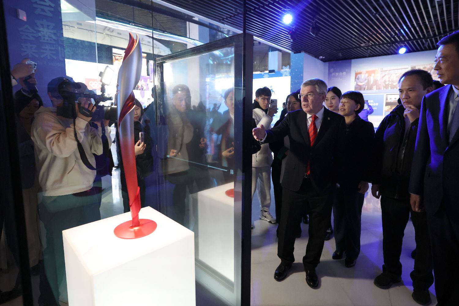 2月20日,国际奥委会主席巴赫参观北京奥运博物馆。他称赞北京“双奥遗产”利用取得丰硕成果,并期待奥林匹克精神能够激励更多人。图为巴赫在北京冬奥会火炬前参观。中新社