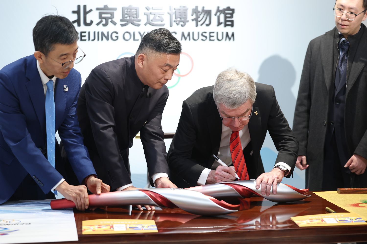 巴赫在北京冬奥会火炬上签名。中新社