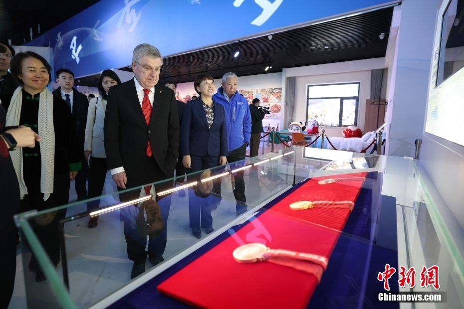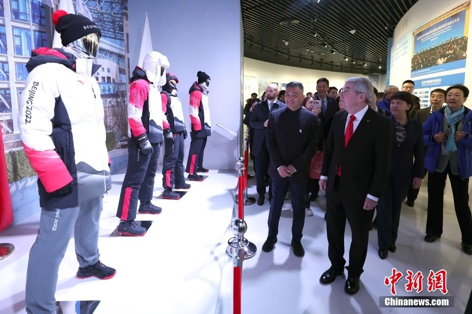 巴赫在北京冬奥会制服装备前参观。中新网