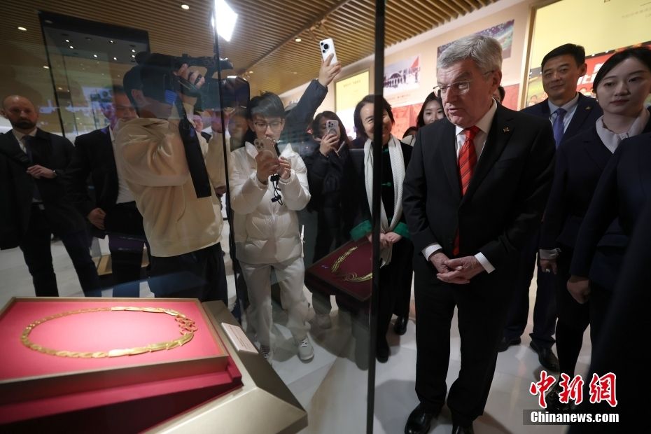 巴赫在奥林匹克金质勋章前参观。中新网