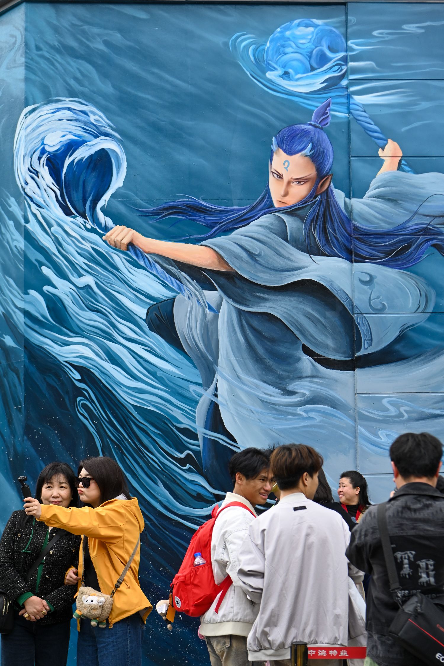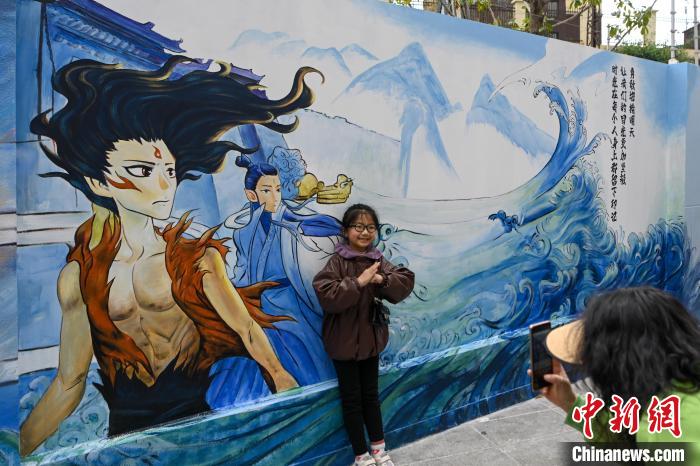 近日,随着《哪吒之魔童闹海》电影热映,中国多地的艺术爱好者发挥奇思妙想,根据动画电影创作多种形式的作品。云南昆明西林社区一组绘有贺岁动画电影《哪吒之魔童闹海》人气角色的大幅墙绘成为市民打卡的热门景点。该组墙绘总面积200余平方米,由六面不同风格和人物组成,其中最长的墙绘长20米。图为2月23日,市民在“敖丙”主题墙前打卡。中新社